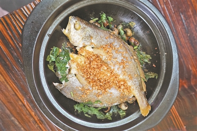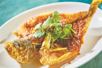 “参巴酱淋黄花鱼”是东南亚风味的黄花鱼烹调法,用新加坡的传统配方,用多达十几种香料手工炒制参巴酱,调入了少许番茄汁、虾酱和酱油,让酱料甜辣酸咸皆备,赋予黄花鱼独特的风味。砂锅黄花鱼汤,是用煎香的黄花鱼经猛火炖煮,炖出奶白色,才算好鱼汤;黄花鱼溜采用福建当地独有的炝溜做法,以纯地瓜粉包裹,保持着鱼肉的嫩滑口感,搭配鲜蔬更开胃;咸鱼炒芥蓝,这或许是从潮汕菜里节俭而来。黄花鱼制作的咸鱼丁成了芥兰的最佳新标配,鱼油让芥兰焕发别样鲜爽。(文、图/广州日报全媒体记者 曾繁莹,通讯员 余静)