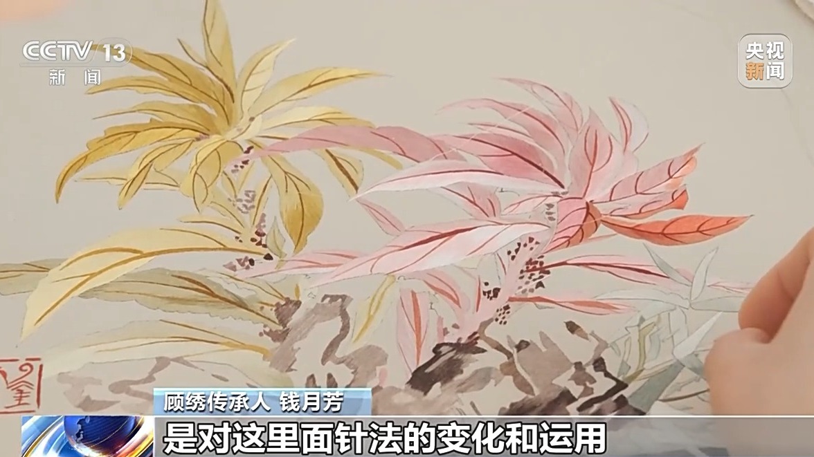 顾绣传承人钱月芳:机器是不能代替人工的,因为机器是呆板的东西,顾绣是一个人对画的理解,是对这里面针法的变化和运用,是灵活掌握。每一个作品做下来,其实是赋予着我们的一种感情,全部表达在这一幅画上面。