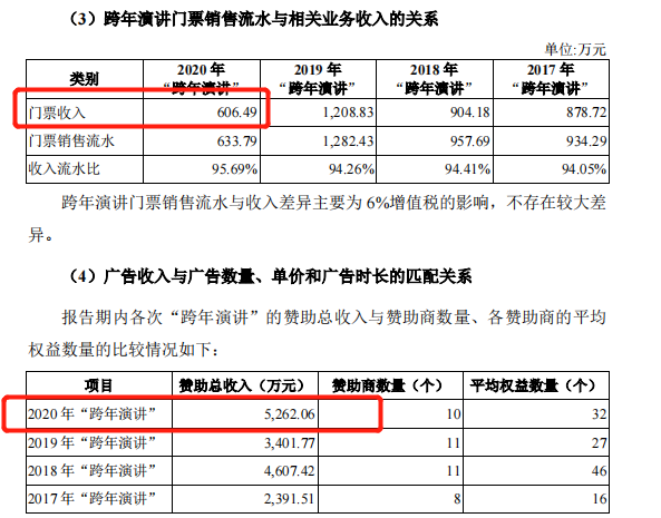 罗振宇不仅是思维造物最大的IP,也是营收贡献的排头兵。他是“时间的朋友”跨年演讲活动中的唯一主讲人、启发俱乐部主讲人。以跨年演讲业务为例,受疫情影响,2020年跨年演讲的上座率只有44.94%。在退票近一半的情况下,跨年演讲的门票收入和赞助收入合计依然高达5868.55万元,当年前五大客户中,有三家客户与跨年演讲赞助有关。仅“时间的朋友”,就为当年营收贡献8.74%,不禁令人感叹“时间确实就是金钱”。