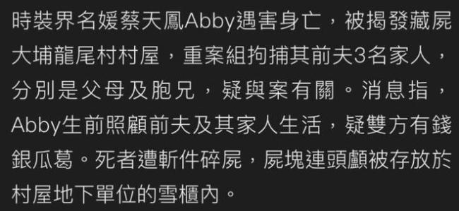 据媒体报道,蔡天凤的遗体是在大埔龙尾村一个出租屋里找到的,尸体藏在冰箱中,法医检查时发现尸体不全,手段惨不忍睹,从现场发的图片看,这个村相对比较偏僻,房子三层高,案发地点在三楼。