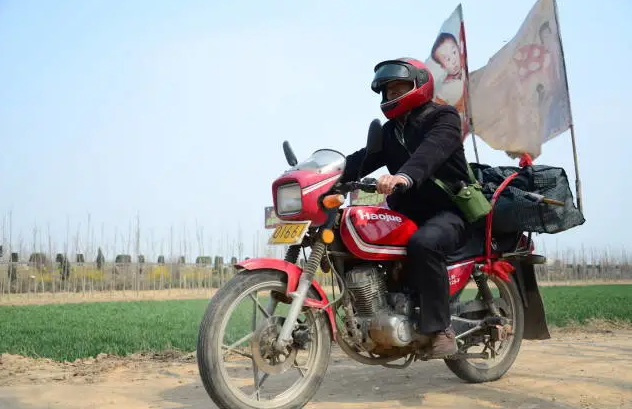 ·郭刚堂骑着摩托车,带着“寻子旗”,走过50万公里寻子路。