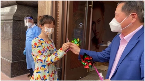 上海环球港复市,月星集团董事局主席丁佐宏送顾客鲜花口红