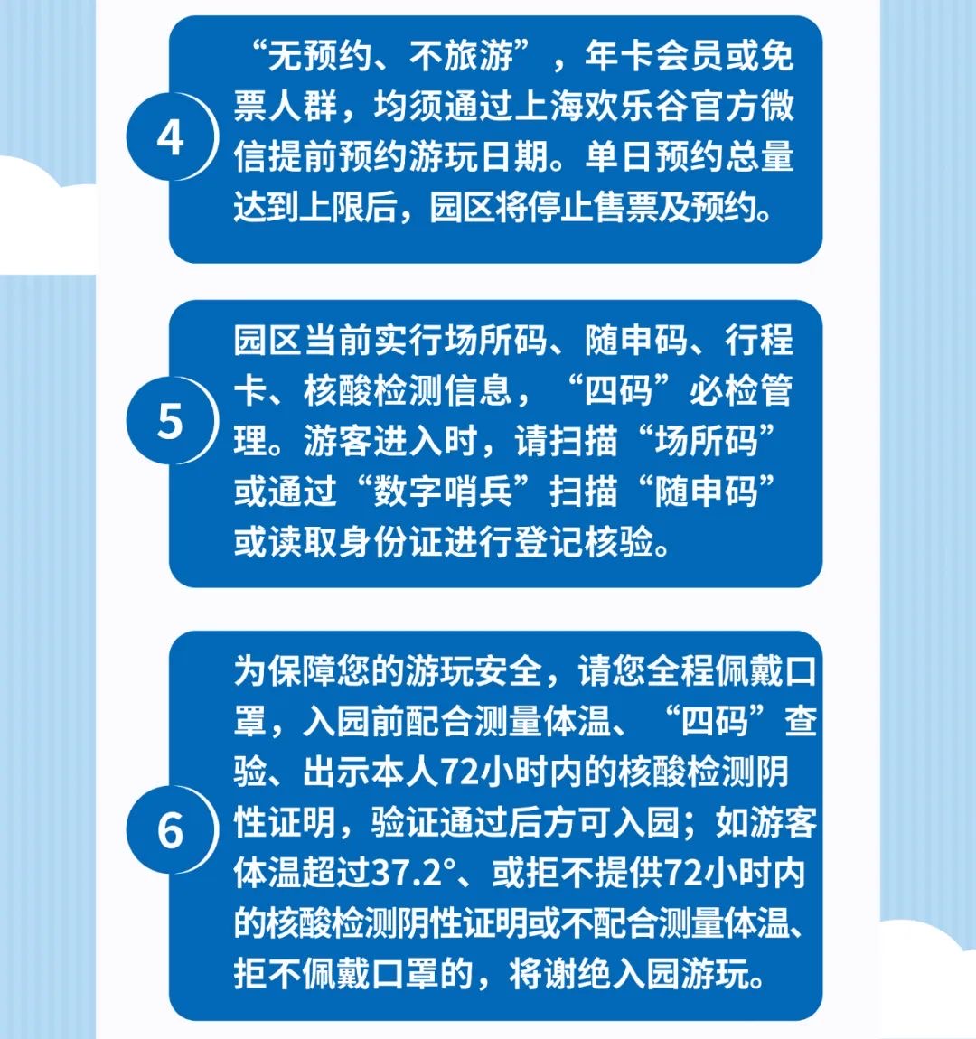 上海欢乐谷园方表示,本次开园严格遵照防疫防控要求,园区内实行限流游览,日接待游客量不超过政府核定最大承载量的75%。坚持“无预约、不旅游”原则,全面实施线上预约购票机制及电子验票无接触式入园,进行场所码、随申码、行程卡、核酸检测信息,“四码”必检管理,游客进入园区须持有72小时内核酸检测阴性证明。