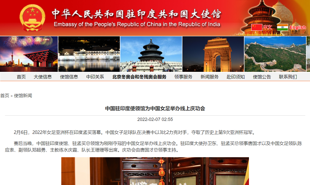 赛后当晚,中国驻印度使馆、驻孟买总领馆为刚刚夺冠的中国女足举办线上庆功会。驻印度大使孙卫东、驻孟买总领事唐国才以及中国女足领队陈应表、副领队郑超勇、主教练水庆霞、队长王珊珊等出席。庆功会由唐国才总领事主持。