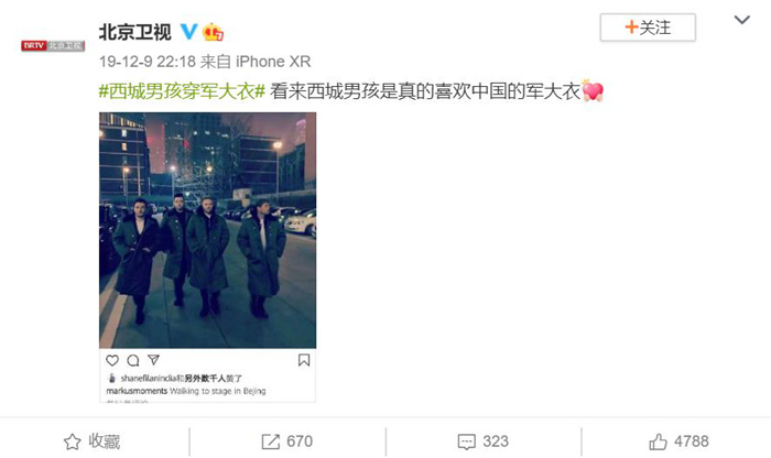 2019年,回归后的西城男孩曾来到中国开演唱会,他们还参加了北京卫视的跨年晚会。当时正值北京降温,四人在彩排中穿上了“中国特产”——军大衣,这张合照一时成为微博热门话题。